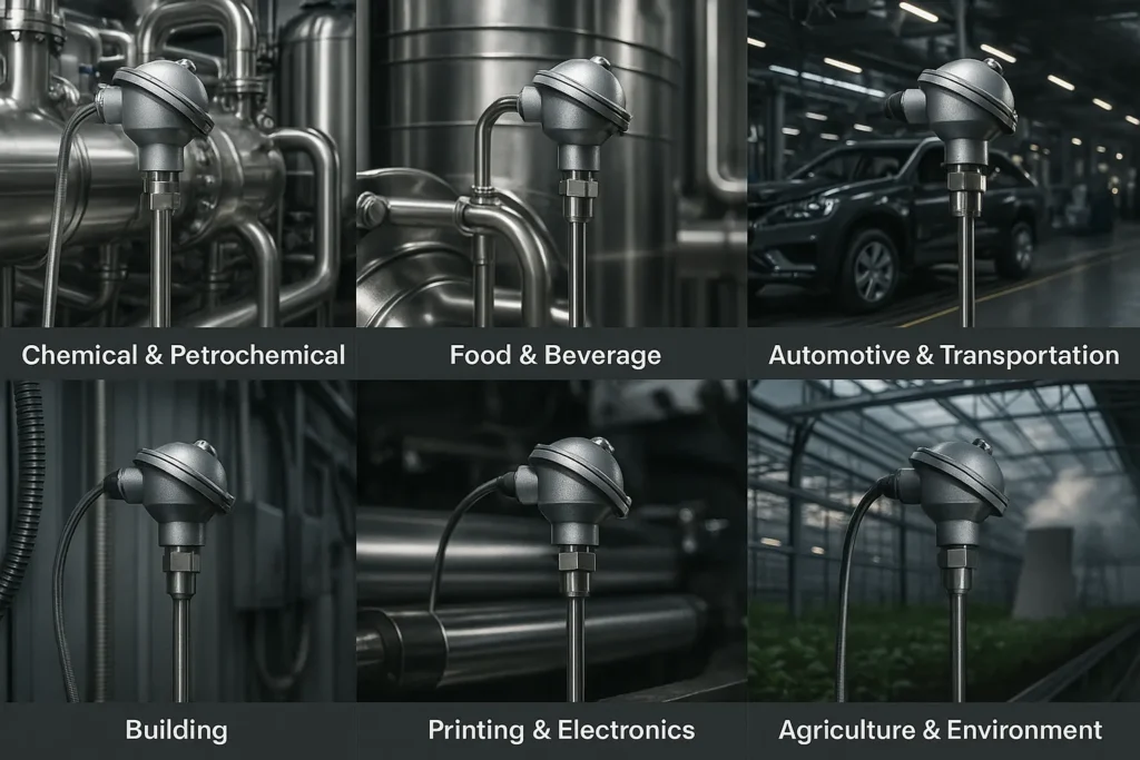 سنسورهای دما در صنایع گوناگون استفاده شده و نقش حیاتی در کنترل، ایمنی، کیفیت و کارایی ایفا میکنند. برخی از این صنایع و کاربرد های آنها عبارتند از: