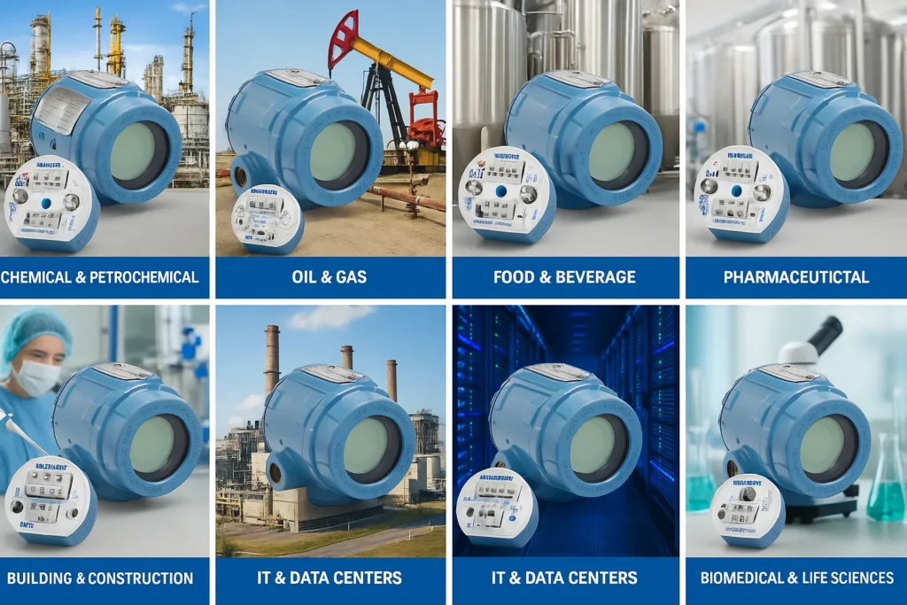 صنایع ساختمانی و تاسیساتی: ترانسمیتر های دما در سیستم های تهویه مطبوع و (HVAC) جهت کنترل دقیق دماهای محیطی، اتاق های سرور و ورودی ها به ساختمان ها استفاده میشوند. این سنجش ها در نهایت مصرف انرژی را بهینه کرده و آسایش ساکنین را افزایش میدهند.